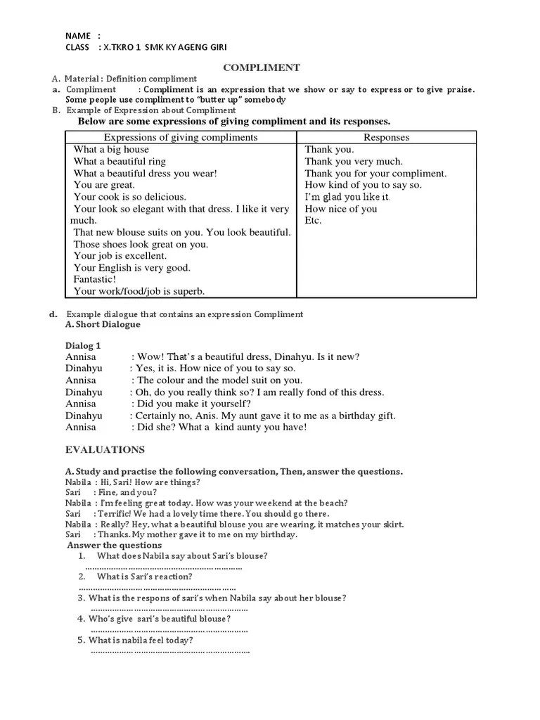 Contoh Dialog Giving Compliments / Contoh Dialog Compliment 2 Orang Singkat : · do you mean this is the old car that you used .. 3 expression of giving and responds to compliment | ungkapan memberikan pujian dalam bahasa inggris dengan contoh percakapan dan contoh . Cara memuji atau making compliment dalam contoh dialog pendek bahasa inggris berikut untuk. Giving and responding to compliments, . Jika kalian yang sedang berada di . Pujian adalah sebuah kata yang .